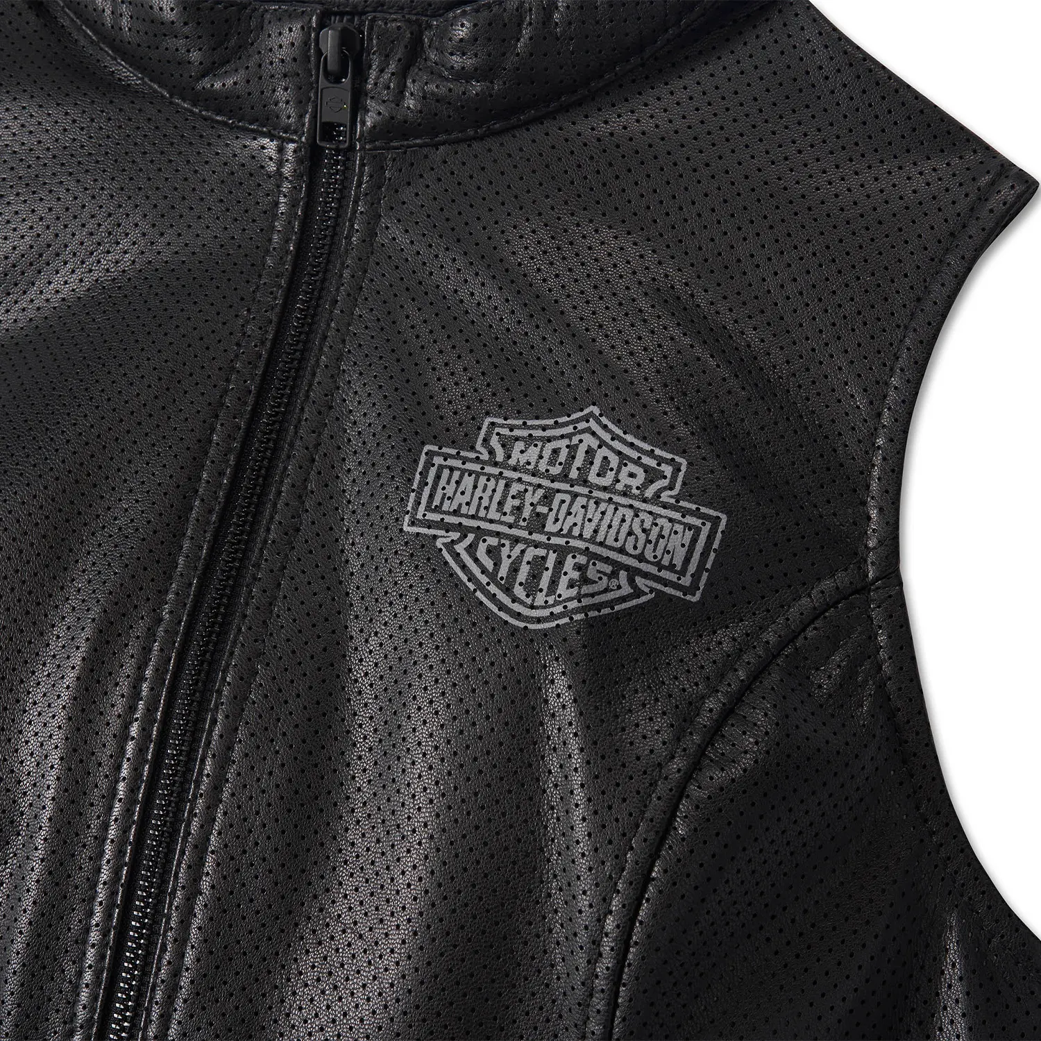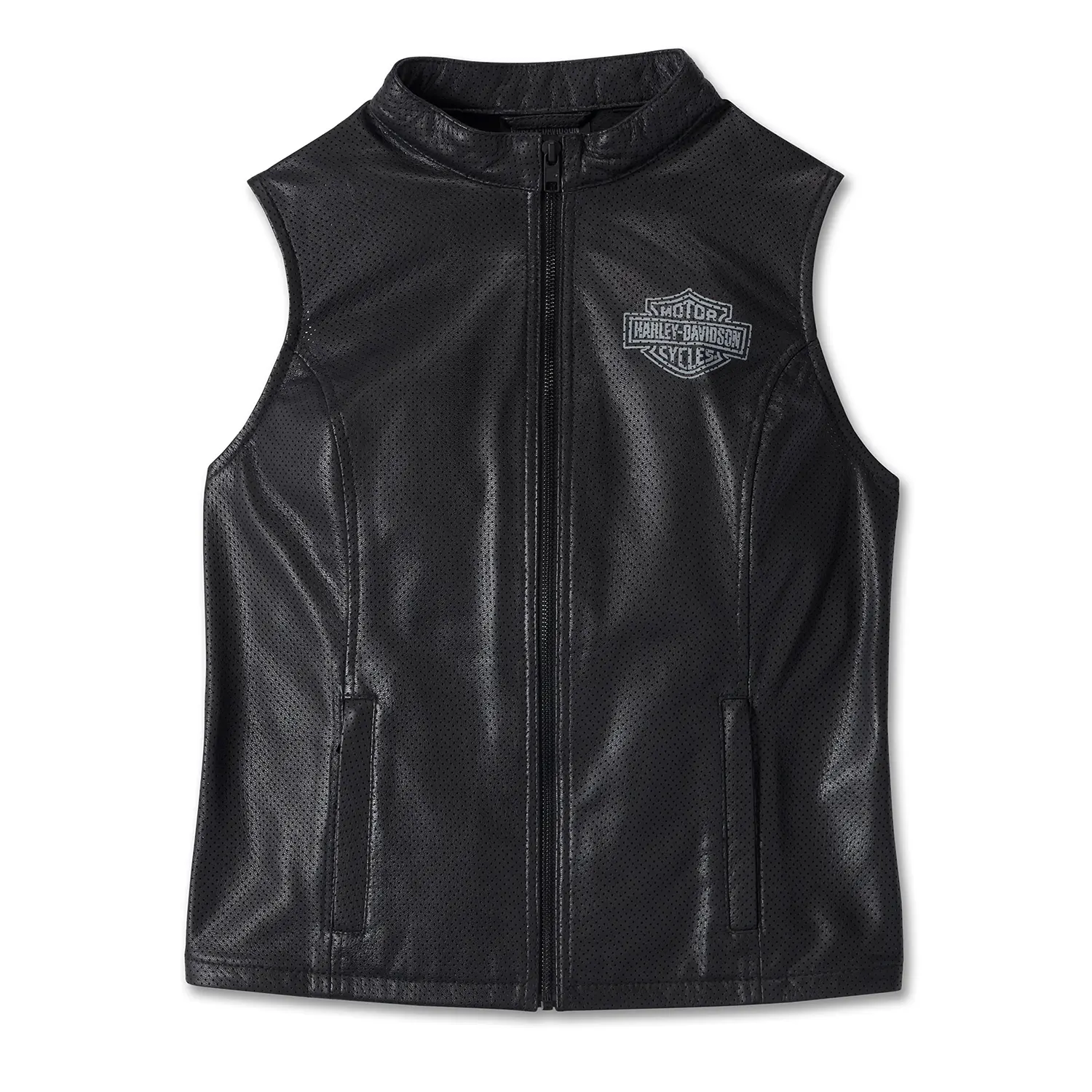 Stay cool and stylish on every ride with this Women Perforated Leather Vest. Crafted from lightweight, buttery-soft goatskin leather, this vest is perforated throughout to maximize airflow—perfect for warm-weather rides. The sleek silhouette features a Mandarin collar, exposed zippers, and an arched lower back seam, blending timeless biker style with comfort.